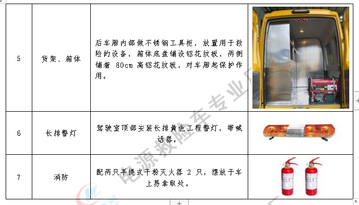 車輛搭載夜間照明燈,監(jiān)控?cái)z像存儲(chǔ),數(shù)據(jù)傳輸,音像系統(tǒng),氣體防護(hù)設(shè)備,傷員簡(jiǎn)單救護(hù),氧氣供應(yīng),擔(dān)架急救和辦公語(yǔ)音調(diào)度等現(xiàn)場(chǎng)作業(yè)設(shè)備。額定載客:4-7人。